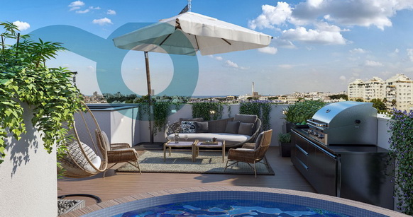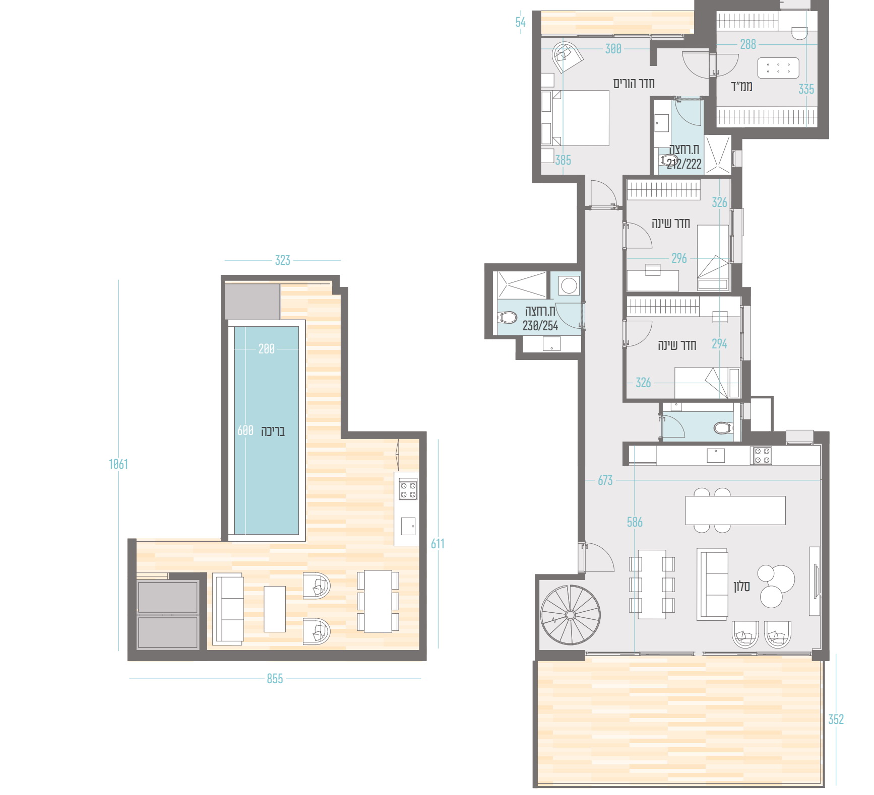 דירת פנטהאוז קומה 5 מס' דירה 20 שטח 128 מ"ר פלוס מרפסת 31 מ"ר פלוס גג 55 מ"ר עם בריכה |